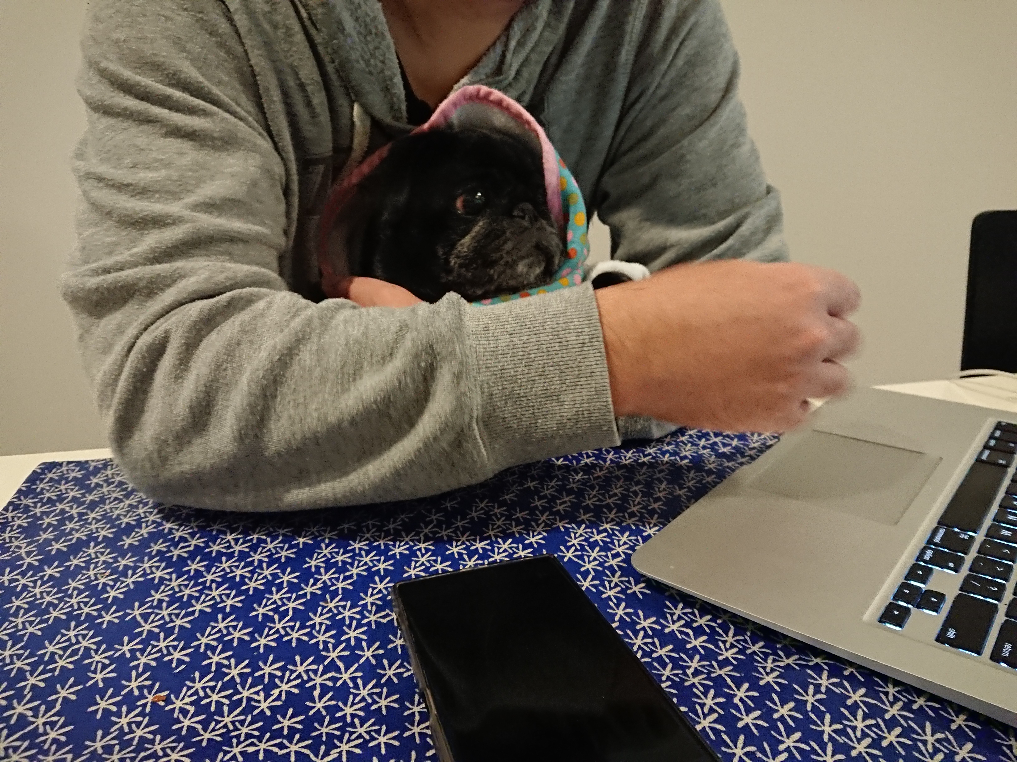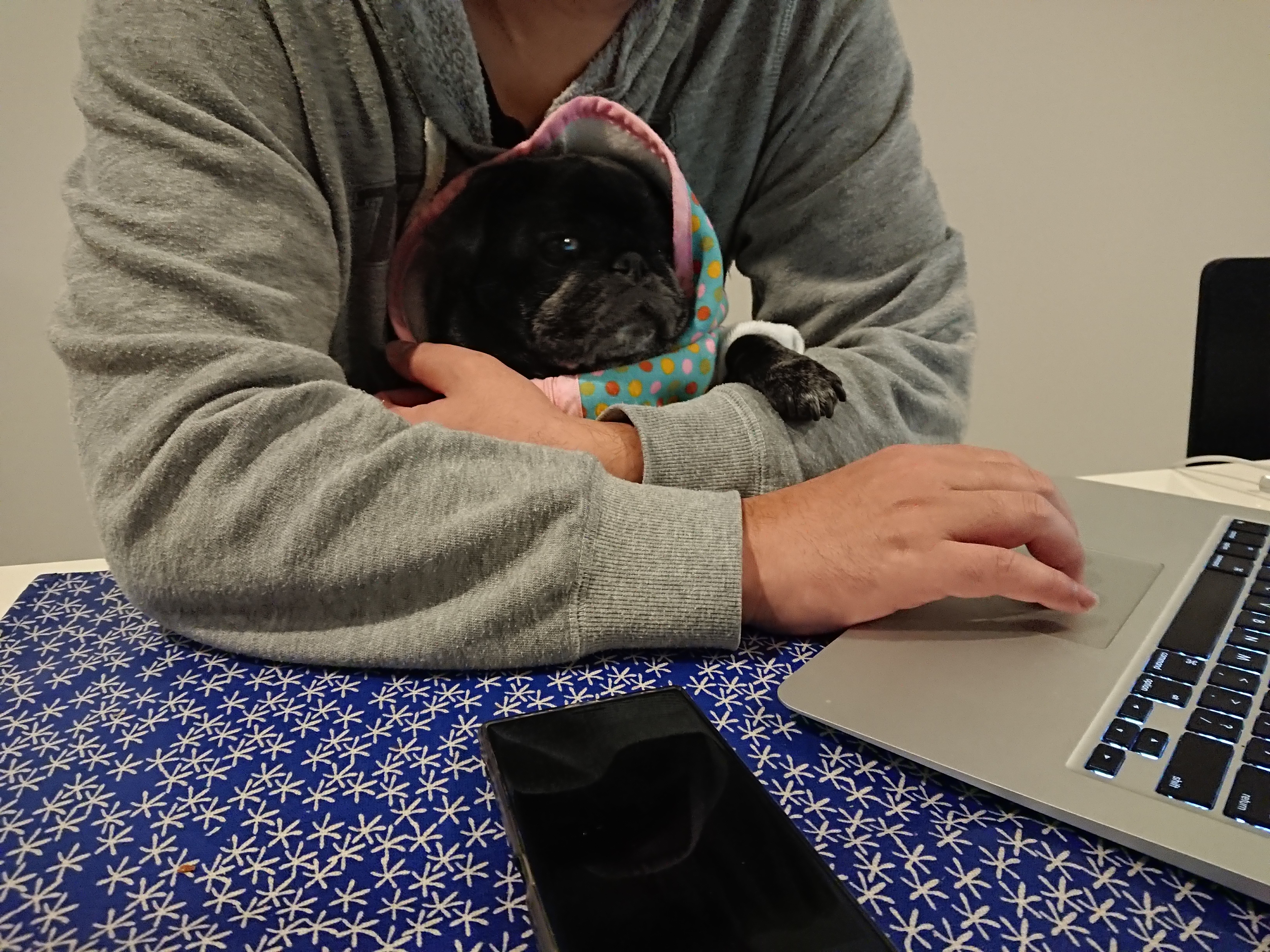 すもも、すもパパに暖かいの着せて もらって抱っこされてる〜